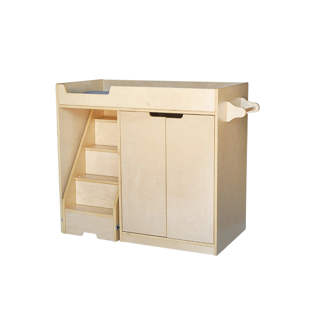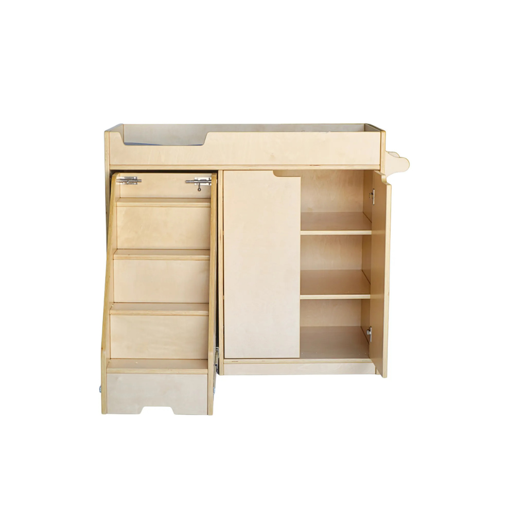 Toddler-friendly step-up change station designed to reduce educator lifting and support independence. Features steps, a secure changing surface, and built-in storage for nappies and essentials - ideal for childcare centres aiming to improve safety and workflow.