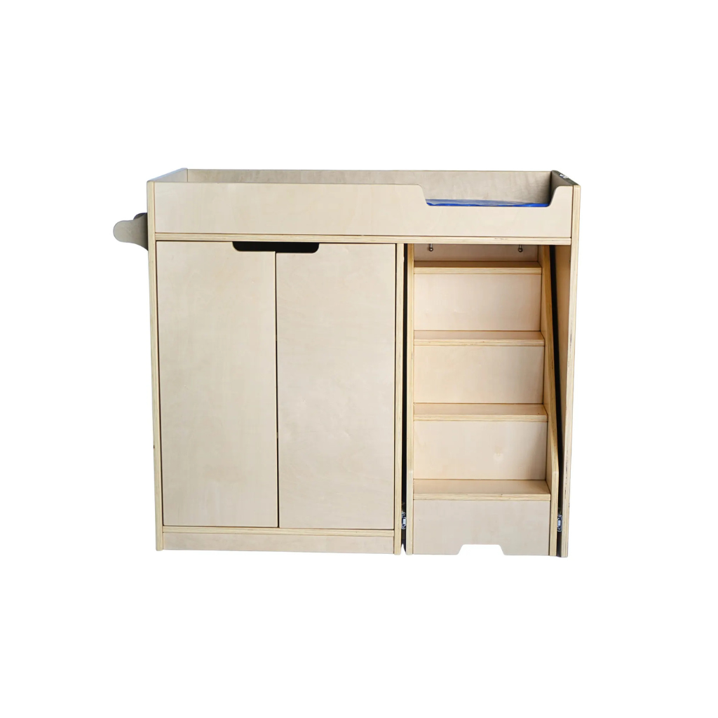 Toddler-friendly step-up change station designed to reduce educator lifting and support independence. Features steps, a secure changing surface, and built-in storage for nappies and essentials - ideal for childcare centres aiming to improve safety and workflow.